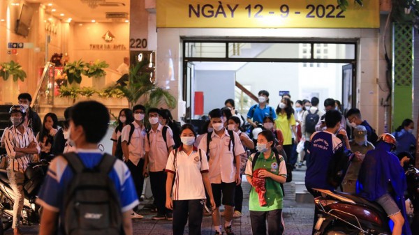 Học sinh sau giờ học thêm ở một trung tâm văn hóa ngoài giờ tại TP.HCM tối ngày 26.9