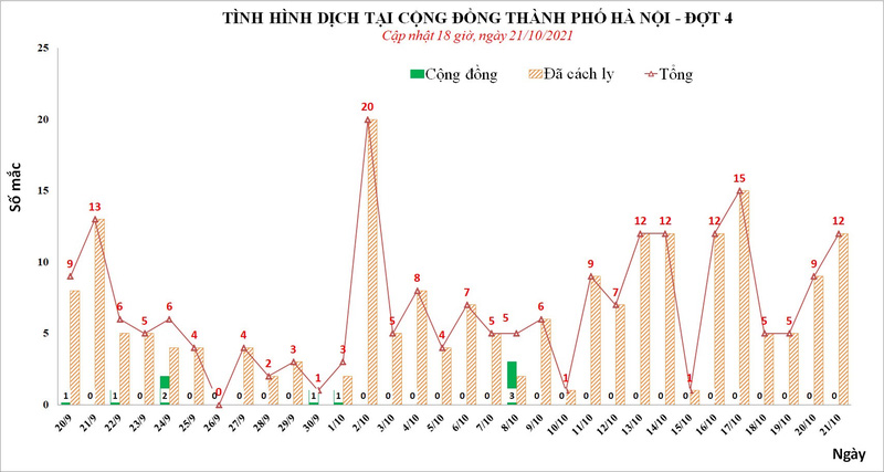 Theo thống kê của Sở Y tế Hà Nội, từ 18h ngày 20/10 đến 18h ngày 21/10, trên địa bàn thành phố ghi nhận 12 ca dương tính mới, đều đã được cách ly.