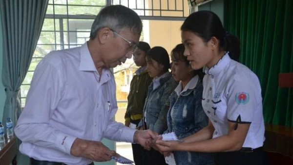 Tác giả, nhà thơ Thanh Thảo (giữa) trao học bổng cho học sinh nghèo |