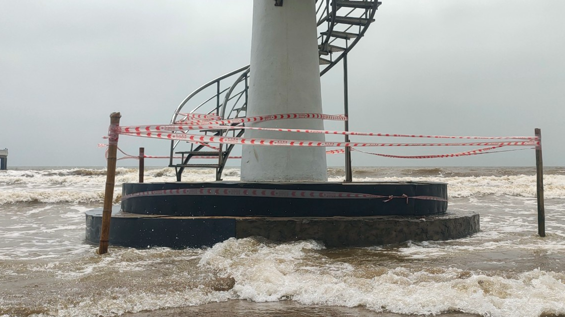 Mới đây, sau khi các bàn tay hoàn thành, các tấm cao su ốp vào trụ các bàn tay đã bị sóng đánh bong tróc, trơ đinh vít tiềm ẩn nguy hiểm cho du khách.