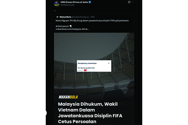Giữa cơn bão chỉ trích sau án phạt của FIFA, Nhiếp chính vương Johor Tunku Ismail đã chia sẻ trên X bài viết từ Malaysia ám chỉ không tốt về bà Nguyễn Thị Mỹ Dung, ‘nữ tướng’ thầm lặng của bóng đá Việt Nam.