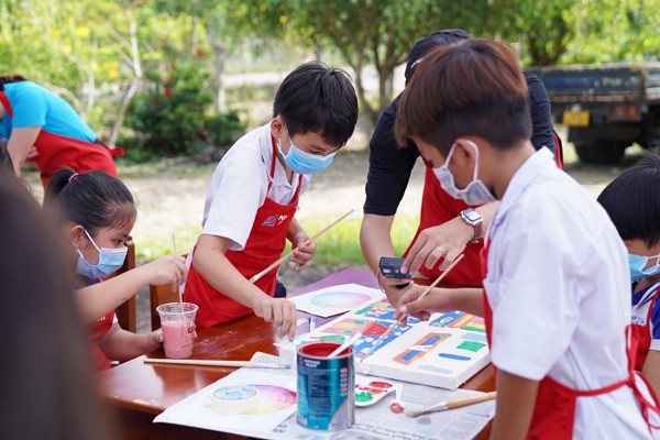 Các em học sinh tham gia lớp học vẽ bằng các màu sơn |