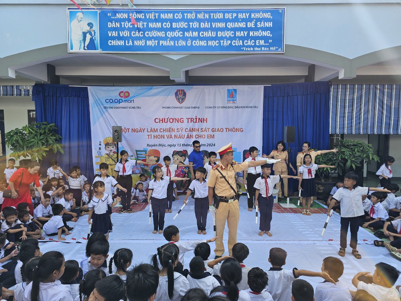 Tại chương trình, hơn 500 học sinh của Trường tiểu học Thống Nhất được cán bộ Phòng CSGT Công an tỉnh Bà Rịa – Vũng Tàu tuyên truyền về an toàn khi tham giao thông đường bộ, quy tắc đi đường cho các em học sinh, các tình huống giả định khi tham gia giao thông.