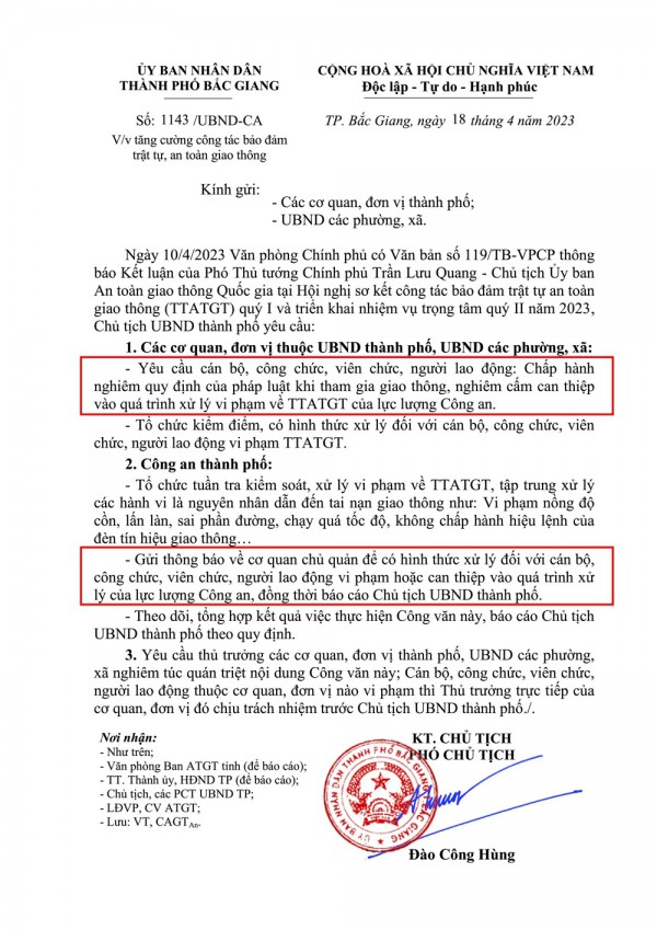 Ngày 18/4, Chủ tịch UBND TP Bắc Giang ban hành Công văn số 1143/UBND-CA yêu cầu công dân chấp hành nghiêm quy định pháp luật khi tham gia giao thông, đồng thời nghiêm cấm can thiệp quá trình xử lý vi phạm của lực lượng Công an.