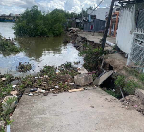 Tuyến đường bê tông có chiều dài 42 m, thuộc khóm 2, P.1, TX.Giá Rai (Bạc Liêu) bị sạt lở hoàn toàn xuống sông Bạc Liêu – Cà Mau.