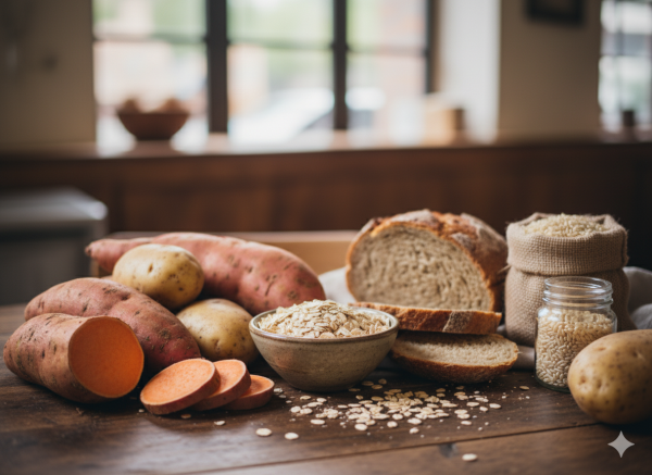 Bữa sáng nên nên chọn các loại carbohydrate hấp thu chậm, có chỉ số đường huyết thấp như ngũ cốc nguyên cám, khoai củ, yến mạch, gạo lứt hay bánh mì đen