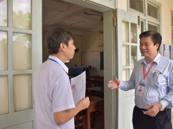 Thứ trưởng Bộ GD-ĐT Nguyễn Hữu Độ (phải) kiểm tra công tác chấm thi tại Quảng Nam