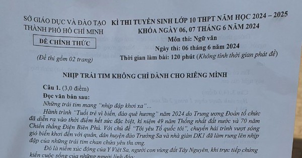 Thí sinh TP.HCM đã thi xong môn ngữ văn trong kỳ thi tuyển sinh vào lớp 10 năm 2024. Chủ đề của đề thi là “Nhịp trái tim không chỉ dành cho riêng mình”. Đáng chú ý, ngữ liệu trong đề thi lớp 10 ở TP.HCM môn ngữ văn được lấy từ các bài viết đăng trên Báo Thanh Niên từ ngày 4.5.2024 đến 13.5.2024.