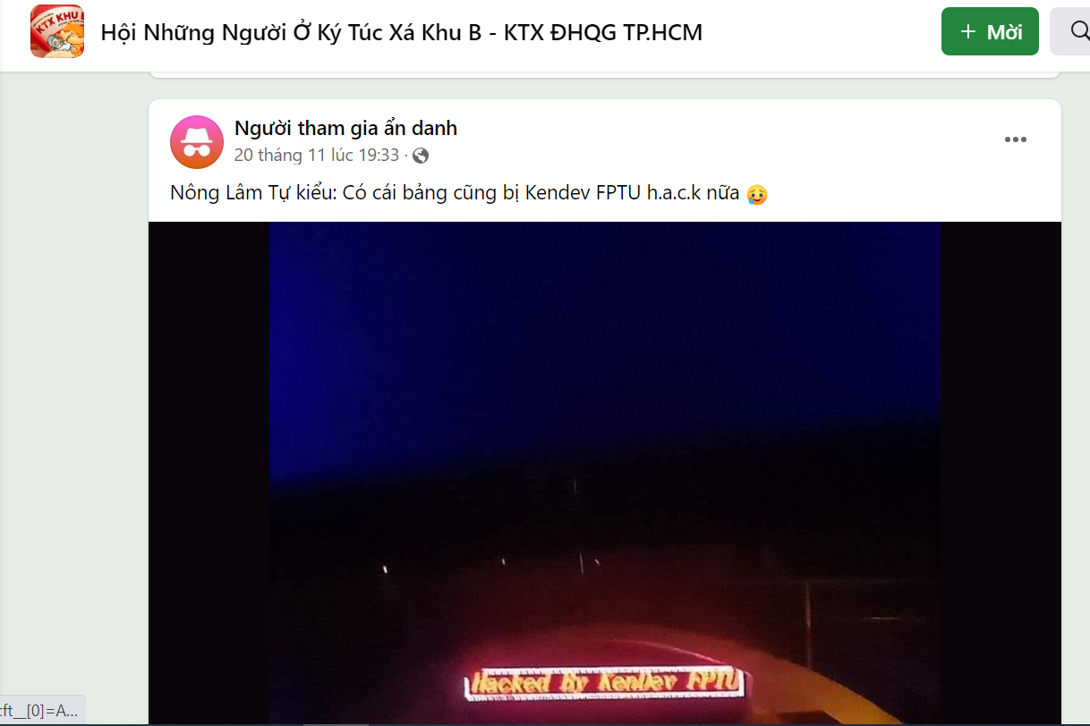 Trước đó, vào tối 20.11, trong các hội nhóm sinh viên trên Facebook tại TP.Thủ Đức đăng nội dung: “Nông lâm tự kiểu: có cái bảng cũng bị Kendev FPTU h.a.c.k nữa”. Dưới bài viết nhiều sinh viên vào bình luận thể hiện sự lo lắng.