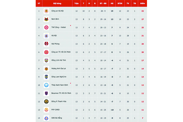 Thể Công Viettel duy trì vị trí tốp 3 với 25 điểm. Trong khi đó, CLB Nam Định giậm chân tại chỗ ở hạng 10 với 12 điểm. Nam Định hiện còn đứng dưới cả HAGL (tốp 8) và SLNA (tốp 9).
