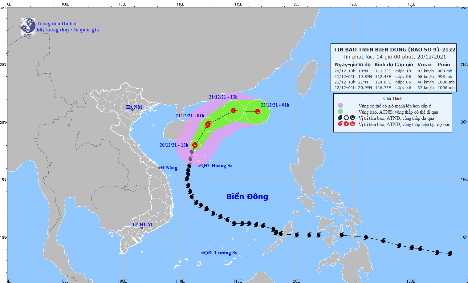 Dự báo trong 24 giờ tới, bão số 9 di chuyển theo hướng Bắc Đông Bắc sau đổi hướng Đông Bắc, mỗi giờ đi được 15- 20 km và suy yếu dần thành áp thấp nhiệt đới. Đến 13 giờ ngày 21.12, vị trí tâm áp thấp nhiệt đới ở khoảng 21,0 độ Vĩ Bắc; 114,6 độ Kinh Đông, cách Hồng Kông (Trung Quốc) khoảng 150 km về phía Nam. Sức gió mạnh nhất vùng gần tâm áp thấp nhiệt đới mạnh cấp 6 (40 – 50 km/giờ), giật cấp 8.