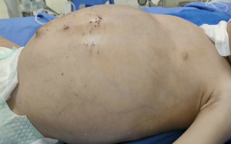 Bệnh nhi nhập viện trong tình trạng li bì, khó thở, vô niệu, bụng chướng căng và trên thành bụng xuất hiện tổn thương do bỏng.