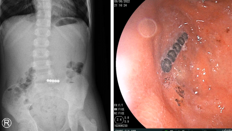 Các bác sĩ đã tiến hành hội chẩn các bác sĩ chuyên khoa tiêu hóa và phối hợp với các bác sĩ ngoại khoa tiến hành nội soi đường tiêu hóa cấp cứu và nội soi ổ bụng, đẩy dị vật từ ruột non lên dạ dày cho bác sĩ tiêu hóa nội soi gắp ra 5 viên bi nam châm dính liền nhau.