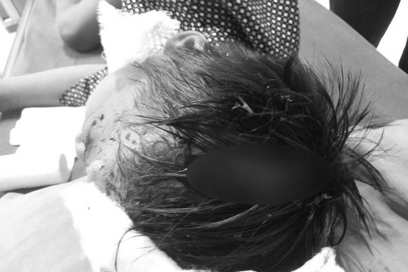 Bé trai được người nhà đưa đi cấp cứu trong tình trạng sợ hãi, hoảng loạn với chằng chịt các vết thương trên cơ thể. Trong đó, vết thương đỉnh phải khoảng 8cm, vết thương đỉnh trái khoảng 6cm sâu lộ xương sọ, vết thương vùng trán khoảng 2cm và các vết thương vùng tay phải kích thước từ 1 – 2cm.