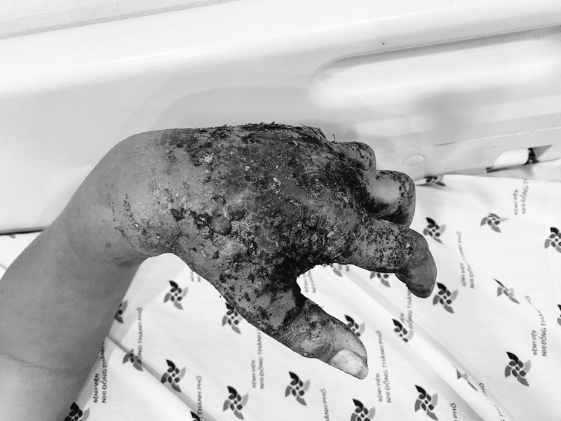 Sau 3 ngày được băng thuốc, bé trai dần giảm đau, nhưng bắt đầu bị nhiễm trùng, nổi bóng nước lan tỏa. Các vết bầm da toàn khắp toàn thân dần lộ diện và lan nhanh. Cơn đau cứ thế lan nhanh nửa thân người trái, bụng ngực trái ê ẩm.