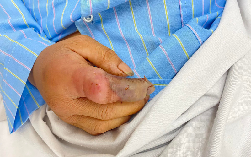 Bệnh nhân nhập viện trong tình trạng mệt mỏi, khó thở, đau nhiều vùng vết thương và có tình trạng phù nề, hoại tử vùng ngón tay do rắn cắn.