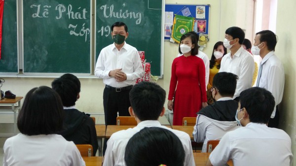 Tại đây, ông Lĩnh đã thăm hỏi tình hình sức khỏe học sinh, đồng thời chúc các em vui khỏe, học tốt. Ông Lĩnh cũng không quên dặn dò học sinh nghiêm túc thực hiện 5K, cẩn trọng để phòng dịch tốt.