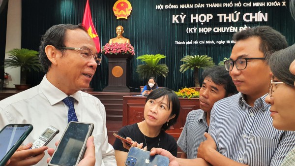 Bí thư Thành ủy TP.HCM Nguyễn Văn Nên trao đổi với các phóng viên bên lề kỳ họp thứ 9 HĐND TP.HCM sáng 18.4