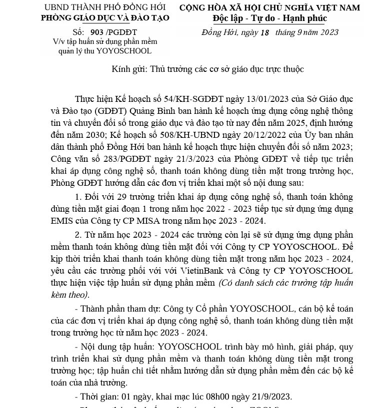 Theo đó, 32 trường triển khai áp dụng thanh toán không dùng tiền mặt giai đoạn 1 (năm học 2022-2023) sẽ tiếp tục sử dụng ứng dụng của Công ty CP MISA trong năm học 2023-2024. Từ năm học 2023-2024, các trường sẽ sử dụng phần mềm thanh toán không dùng tiền mặt của Công ty CP YOYOSHOOL.