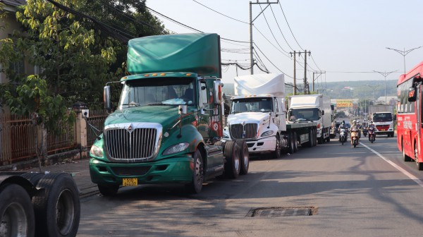 Nhiều xe đầu kéo đậu nối đuôi nhau trên đường ĐT.741