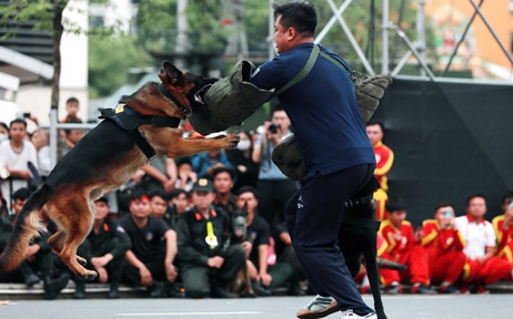 Màn biểu diễn ấn tượng của chó nghiệp vụ cùng huấn luyện viên đến từ Trung tâm Huấn luyện và sử dụng động vật nghiệp vụ, thuộc Bộ Tư lệnh Cảnh sát cơ động, mang đến cảm giác hồi hộp cho hàng trăm du khách