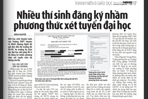 Trước đó, Báo Thanh Niên đã phản ánh nhiều thí sinh đăng ký nhầm phương thức xét tuyển vì năm nay có quá nhiều phương thức cùng tồn tại trên hệ thống của Bộ GD-ĐT. Có thí sinh trường chuyên đã 2 lần gửi đơn kêu cứu đến Bộ trưởng Nguyễn Kim Sơn vì nhầm lẫn này.