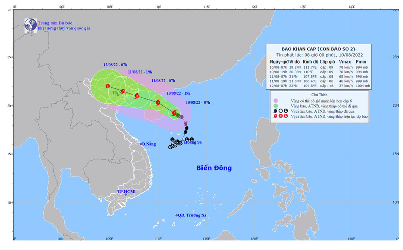 Theo Trung tâm dự báo khí tượng thủy văn Quốc gia, chiều ngày 9/08 áp thấp nhiệt đới đã mạnh lên thành bão, cơn bão số 2 năm 2022 và có tên quốc tế là Mulan. Hồi 13 giờ ngày 9/8, vị trí tâm bão số 2 (bão Mulan) ở vào khoảng 17,3 độ Vĩ Bắc; 112,9 độ Kinh Đông, trên khu vực phía Đông Bắc quần đảo Hoàng Sa; cách đảo Hải Nam (Trung Quốc) khoảng 300 km về phía Đông Nam. Sức gió mạnh nhất vùng gần tâm bão mạnh cấp 8 (62 – 74 km/giờ), giật cấp 10. Bán kính gió mạnh cấp 6, giật cấp 8 khoảng 110 km tính từ tâm bão.
