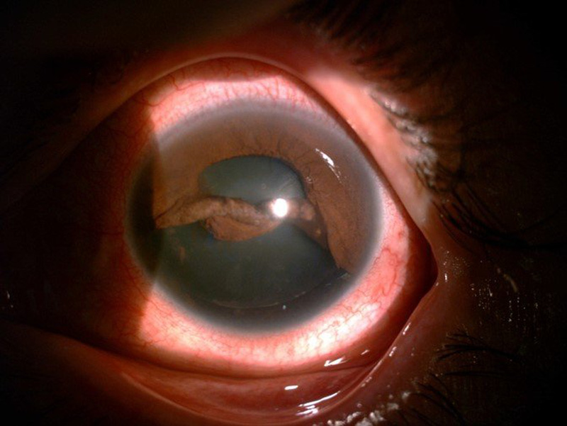 Bệnh nhân Đ. là một trong những trường hợp tổn thương nặng, phức tạp đứt chân mống mắt rộng gần 6 cung giờ ở phía nữa dưới, mống mắt bị đứt cuộn dính vào nhau và vào mặt trước thủy tinh thể, kết hợp với đục và bán lệch T3, tăng nhãn áp.