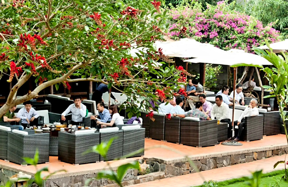 Khách uống cà phê tại Làng cà phê Trung Nguyên (TP.Buôn Ma Thuột)