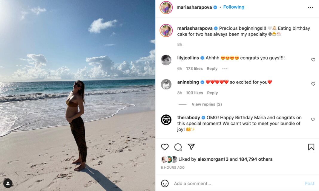 Mới đây, Maria Sharapova cho biết cô đang có thai và sắp sinh em bé là con đầu lòng qua dòng trạng thái: “Sự khởi đầu quý giá!!! Ăn bánh sinh nhật cho hai người luôn là sở thích của tôi”. Kèm theo đó là bức ảnh cô khoe đang mang bầu đứng trên bãi biển Malibu.