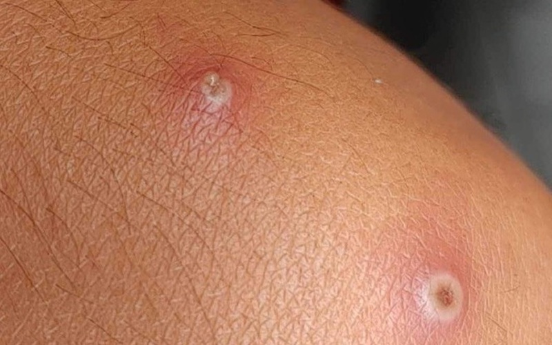Đến ngày 22/2/2024, bệnh nhân xuất hiện những mụn mủ, bóng mủ đa kích thước, số lượng nhiều, rải rác ở mặt, cổ, cánh tay, bàn tay bàn chân, cẳng chân, bìu. Bệnh tình không giảm, xuất hiện bóng mủ vỡ rỉ dịch lan rộng ra bàn tay chân, cánh tay cẳng chân, mặt, cổ.