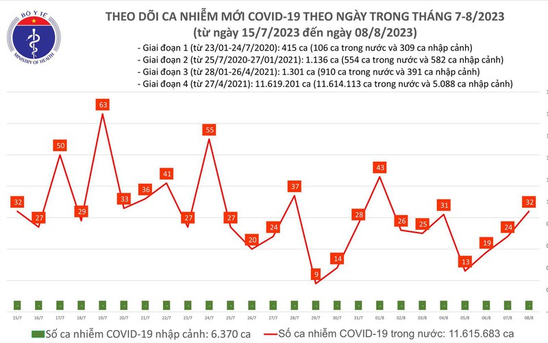 Theo Bản tin Bộ Y tế về tình hình chống dịch COVID-19, trong ngày 8/8, cả nước ghi nhận 32 ca mắc mới, có 8 bệnh nhân được công bố khỏi bệnh.