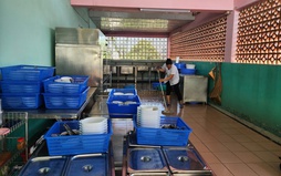 Nhân viên vệ sinh khu vực nhà bếp, khu dọn rửa dụng cụ nấu nướng, khay cơm, đảm bảo an toàn tại trường mầm non tại TP.HCM