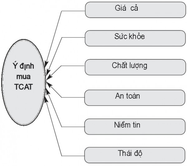 Sau khi tổng hợp các cơ sở lí thuyết và các mô hình nghiên cứu, nhóm tác giả nhận thấy, ý định mua TCAT của người tiêu dùng phụ thuộc vào nhiều yếu tố khác nhau. Qua sự tổng hợp trên, nhóm quyết định đưa ra mô hình nghiên cứu đề xuất phụ thuộc vào 6 yếu tố, gồm: (1) Giá cả, (2) Sức khỏe, (3) Chất lượng, (4) An toàn, và (5) Niềm tin và (6) Thái độ.