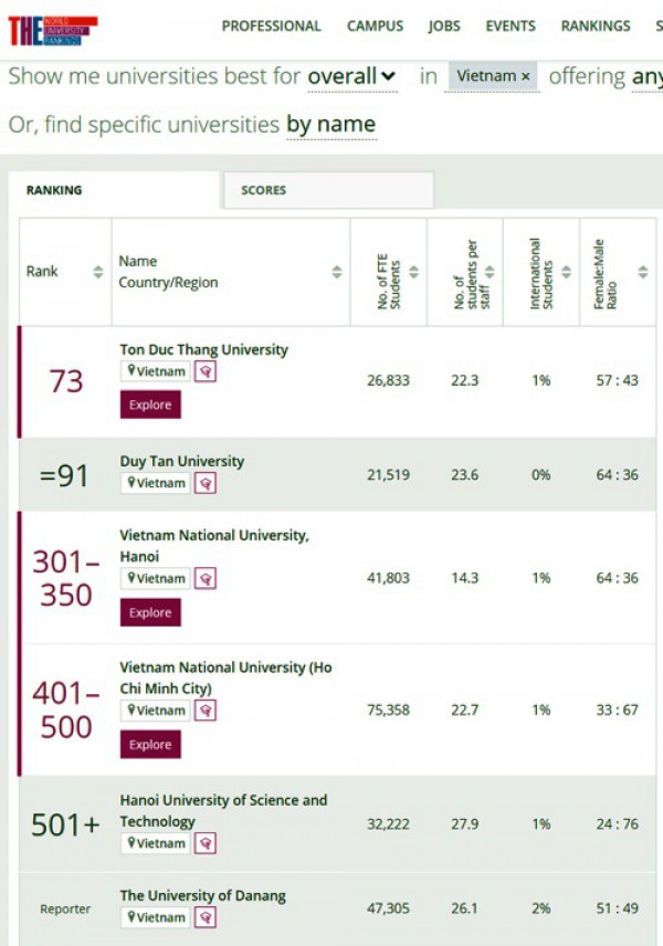 Như vậy, cùng với 3 trường đại học Việt Nam đã được xếp hạng từ năm 2021, Việt Nam đã có 5 trường đại học lọt vào Top 100 Trường đại học tốt nhất châu Á năm 2022. Cụ thể: Một trường ở TP.HCM xếp vị trí 73; Trường ĐH Duy Tân, xếp vị trí =91; ĐH Quốc gia Hà Nội, xếp vị trí 301-350; ĐH Quốc gia TP.Hồ Chí Minh (HCM), xếp vị trí 401-500; Trường ĐH Bách khoa Hà Nội, xếp vị trí 500+