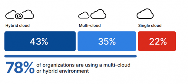 Trong năm 2024, phần lớn các tổ chức (78%) đều lựa chọn chiến lược đám mây hỗn hợp và đa đám mây. Trong số đó, 43% các tổ chức sử dụng cơ sở hạ tầng hỗn hợp giữa đám mây và tại chỗ, và 35% áp dụng chiến lược đa đám mây. Những con số này chỉ tăng nhẹ so với hai năm trước, khi đó 39% tổ chức sử dụng chiến lược đám mây hỗn hợp và 33% là đa đám mây.