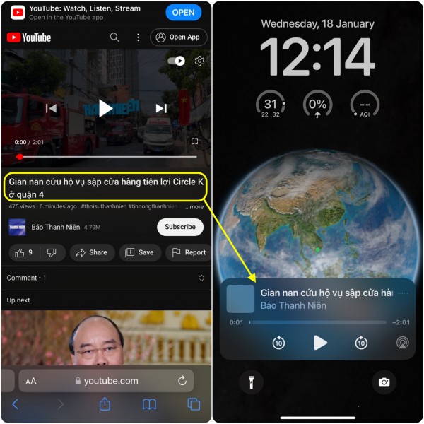 Khi bật màn hình, bạn không cần đăng nhập vào iPhone mà chỉ cần vuốt từ góc bên phải màn hình xuống để mở Control Center. Lúc này ở khu vực nút Play đã có tên video YouTube bạn bật trước đó, bạn bấm Play và nội dung đó sẽ tiếp tục phát ngay cả khi bạn tắt màn hình iPhone.