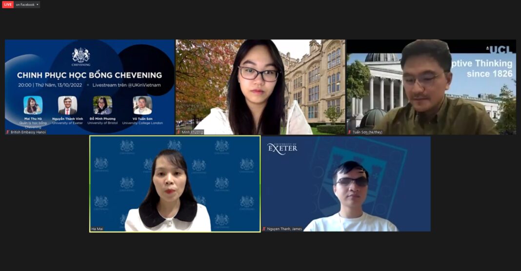 Chia sẻ tổng quan về Chevening trong buổi tư vấn trực tuyến tối 13.10, bà Mai Thu Hà, Quản lý học bổng tại Việt Nam, cho hay đây là học bổng toàn phần của Chính phủ Anh hiện được triển khai ở 160 quốc gia, vùng lãnh thổ.