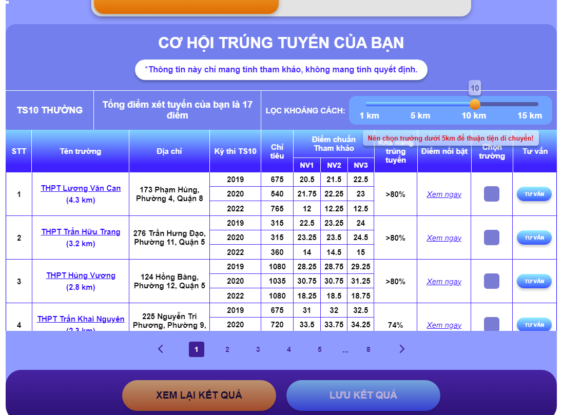 Bên cạnh đó, trang tư vấn trực tuyến này còn tích hợp bản đồ GIS, để đưa ra những cảnh báo về phạm vi di chuyển từ nơi cư trú đến trường THPT. GIS là ứng dụng được Sở GD-ĐT TP.HCM triển khai từ năm học trước nhằm giúp học sinh tránh tình huống chọn trường THPT vượt quá khả năng di chuyển.