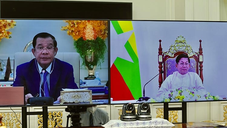 Theo thông cáo báo chí của Bộ Ngoại giao và Hợp tác Quốc tế Campuchia, Thủ tướng Campuchia đã có cuộc hội đàm trực tuyến với Thống tướng Min Aung Hlaing, người đứng đầu chính quyền quân sự Myanmar để thảo luận về tình hình Myanmar và tiến trình thực hiện 5 điểm đồng thuận.