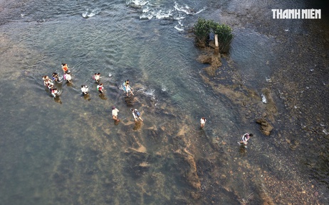 Tháng 4, dòng sông hiền hơn mùa mưa, mặt nước rộng chừng 50 m, có đoạn chỉ ngang lưng người lớn. Nhưng dưới là lớp đá cuội phủ rong rêu trơn trượt, tiềm ẩn nhiều “bẫy ngầm”. Chỉ một bước trượt chân, cả người lớn lẫn trẻ nhỏ có thể ngã, đối mặt nguy cơ bị nước cuốn.