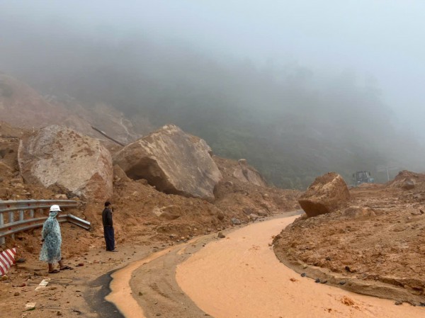 Lực lượng chức năng đang giải tỏa đường sạt lở đèo Khánh Sơn