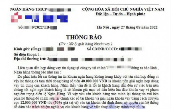 Thông báo cũng nêu “nghi ngờ khách hàng là tài khoản giả mạo có dấu hiệu lừa đảo khoản vay… yêu cầu khách hàng xác minh lại thông tin với bên hệ thống để chỉnh sửa lại chính xác số tài khoản và giải ngân khoản vay bằng cách chuyển cọc 12 triệu đồng (tức 30% giá trị) vào tài khoản chỉ định được ủy quyền của hệ thống để đảm bảo trách nhiệm nghĩa vụ”.