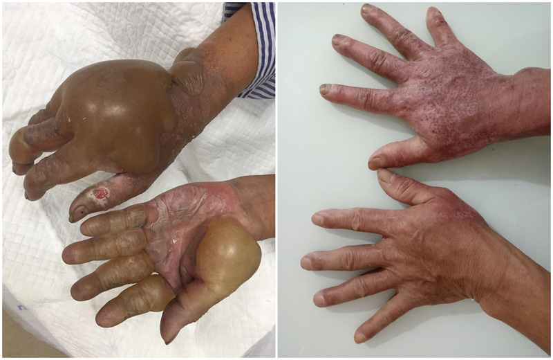 Bàn tay của bệnh nhân phục hồi trước và sau điều trị. Ảnh: BVCC