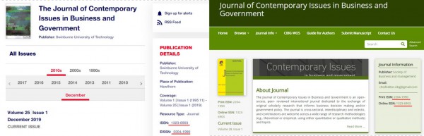 Tạp chí Journal of Contemporary Issues in Business And Government gốc (trái) tại địa chỉ https://search.informit.org/journal/jcibg và tạp chí mạo danh (phải) tại địa chỉ https://cibgp.com