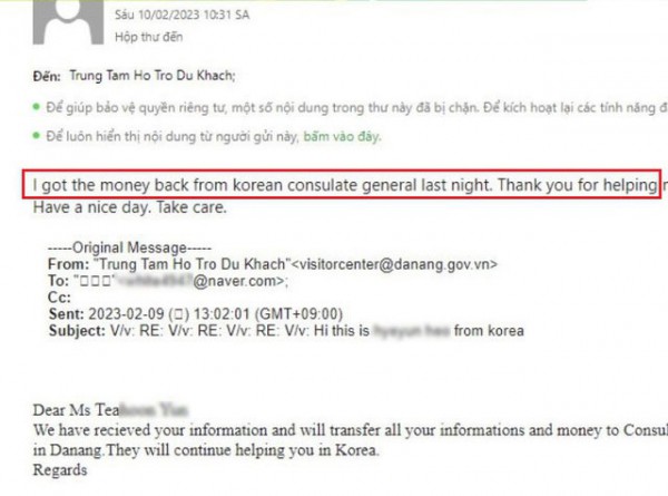 Theo bà Huỳnh Thị Hương Lan, Phó giám đốc Trung tâm xúc tiến du lịch (Sở Du lịch TP.Đà Nẵng), tại thời điểm làm rõ sự việc và tài xế taxi nộp lại tiền, nữ du khách Hàn Quốc đã trở về nước. Tuy nhiên, Trung tâm hỗ trợ du khách TP.Đà Nẵng đã tìm cách liên hệ qua email và mạng xã hội để có phương thức trả lại tiền phù hợp. Qua thời gian trao đổi, đến ngày 10.2, nữ du khách Hàn Quốc T.H.Y phản hồi đã nhận được đầy đủ số tiền bị “chặt chém”.