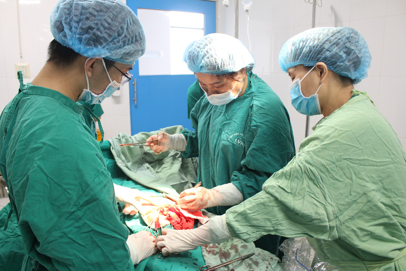 Các bác sĩ tiến hành xử trí khâu tử cung bị vỡ cho sản phụ. Ảnh: BVCC