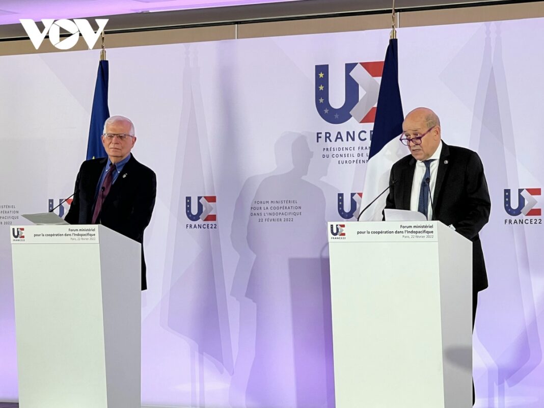 Hơn 60 quan chức là các Ngoại trưởng, Thứ trưởng Ngoại giao hay Đại sứ các nước Liên minh châu Âu, các quốc gia ASEAN, các cường quốc Đông Á, Nam Á cũng như một số quốc đảo Nam Thái Bình Dương đã tham dự Diễn đàn về hợp tác tại khu vực Ấn Độ – Thái Bình Dương, lần đầu tiên được Liên minh châu Âu tổ chức tại thủ đô Paris – Pháp trong ngày 22/2, theo sáng kiến của Pháp, nước đang giữ chức Chủ tịch Hội đồng châu Âu. Đại sứ Việt Nam tại Pháp, Đinh Toàn Thắng, đại diện làm Trưởng đoàn Việt Nam tham dự Diễn đàn. Đại diện hai cường quốc Mỹ và Trung Quốc không góp mặt.