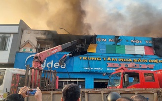 Lực lượng chữa cháy đã dùng xe cần cẩu phá khu vực tầng trên của cửa hàng điện máy để dập lửa.