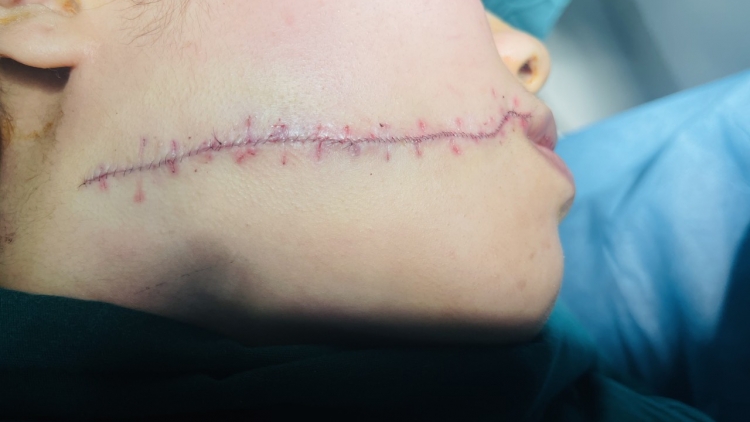 Bệnh nhân Đ.Y.N (22 tuổi) nhập viện trong tình trạng má phải được khâu chằng chịt, vết sẹo dài hơn 10cm. Qua khai thác bệnh sử, bệnh nhân cho biết ngày 28/4/2022 vừa qua có xảy ra cãi vã với bạn trai. Trong lúc nóng giận, nghi bị “ngáo đá”, người bạn trai đã dùng dao chặt thịt bò kề cổ chém loạn xạ, chị N. dùng tay đỡ nên đường dao chệch hướng, rạch một đường dài trên cánh tay, riêng vùng má phải bị dao chém rất sâu, kéo dài từ khóe miệng kéo đến mang tai.